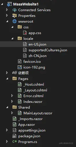 Masa Blazor App的模板创建的是一个没有携带解决方案的项目模板,默认项目结构如图: