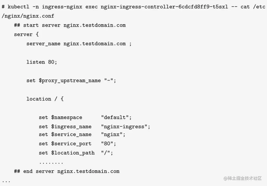 找到Nginx Ingress Controller对应的容器后查看里面的Nginx配置文件,生成的对应配置段如下所示: