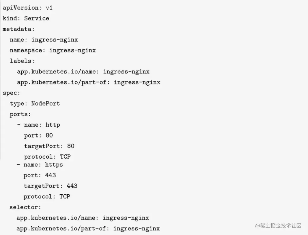 Nginx Ingress Controller容器监听在80和443端口上。Nginx Ingress Controller这个Deployment是在集群内部署的,还需要把它暴露给集群外。一个使用NodePort暴露服务的配置如下所示: