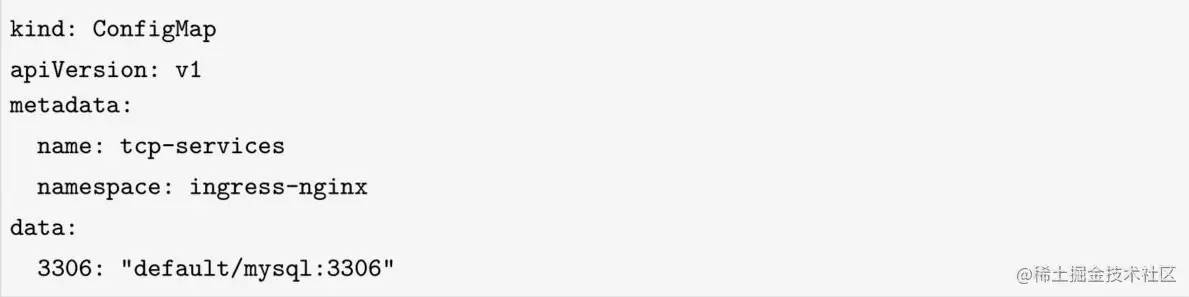 下面这个例子就是上文提到的ingress-nginx/tcp-services这个Configmap对象,意思是访问Ingress的3306端口,流量转发给default namespace中名为mysql的Service的3306端口。