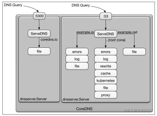 这是同一个DNS server但是负责不同zone的解析,而且有不同的插件链。