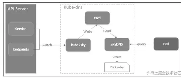 不难看出,SkyDNS是真正对外提供DNS查询服务的组件,kube2sky是Kubernetes到SkyDNS之间的“桥梁”,而etcd则存储Kubernetes只涉及域名解析部分的API对象。这个版本的Kube-dns选择直接部署SkyDNS进程来提供域名解析服务。