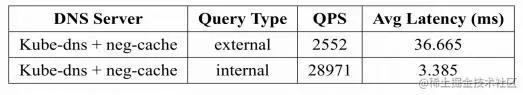 表4-6 Kube-dns在缓存中存储了负面响应时响应内/外部域名请求的QPS与时延