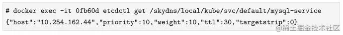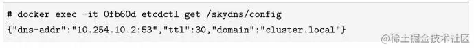 如上所示,位于default namespace的服务mysql-service的Cluster IP为10.254.162.44。SkyDNS的基本配置信息也存在etcd中,例如Kube-dns IP地址、域名后缀等。如下所示: