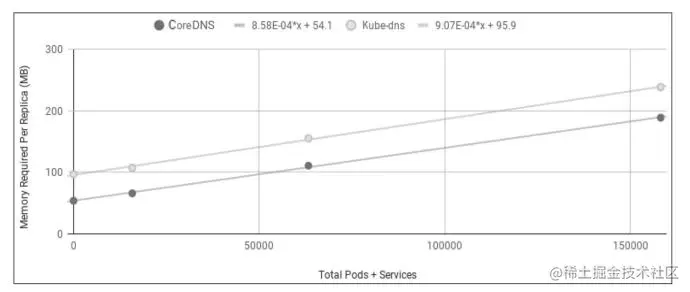 CoreDNS和Kube-dns都维护集群中所有服务和端点的本地缓存。因此,随着服务和端点数量的增加,每个DNS Pod的内存要求也会增加。在默认设置下,CoreDNS应该比Kube-dns使用更少的内存,这是由于部署Kube-dns需要使用三个容器,而CoreDNS只要一个容器便足够。