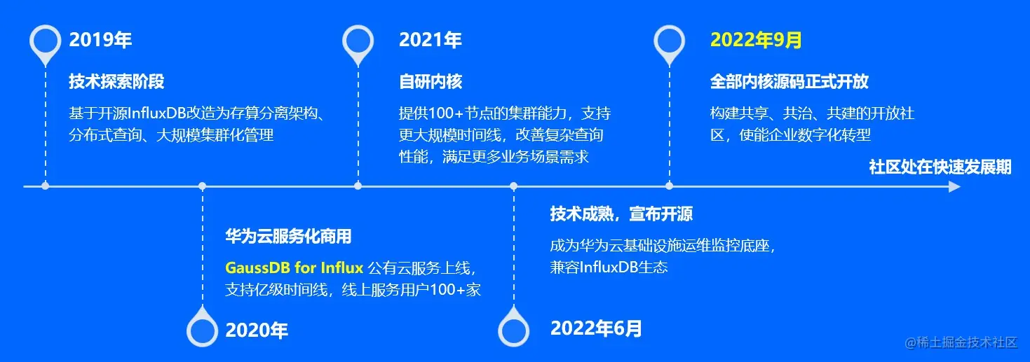 如图所示,openGemini经历了最初由InfluxDB改造的技术探索,到云服务商用、自研内核增强和开源等多个阶段的发展,经受住了华为云内外部100余家用户不同业务场景的打磨和检验,现已开放全部核心源码,全面拥抱开源,打造共享、共治、共建的开发社区,构建全球技术生态和影响力。