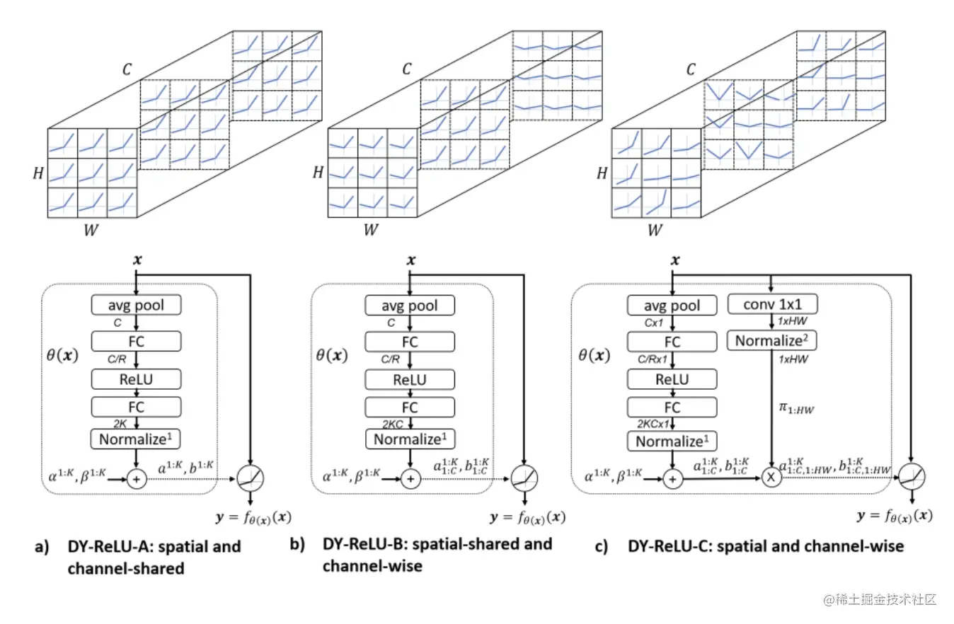 论文提供了三种形态的DY-ReLU,在空间位置和维度上有不同的共享机制,如下图所示: