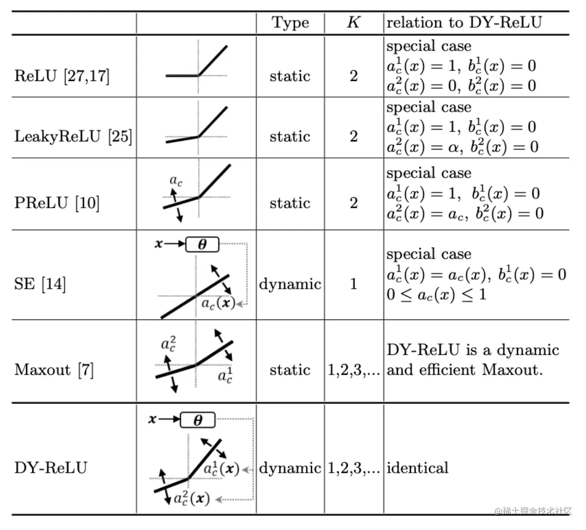 如上图所示,论文中提出的Dynamic ReLU是一种分段函数,能够在带来少量额外计算的情况下,显著地提高网络的表达能力。下图列出了Dynamic ReLU与其他类型激活函数的不同: