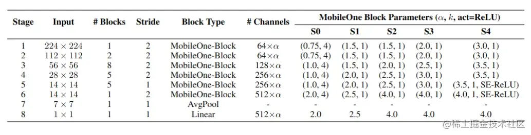 作者提出了 5 种不同大小的模型结构,如图 6 所示,整体延续了 RepVGG 的架构,一共 8 个 stage,其中 6 个 stage 的 Block Type 为 MobileOne Block,1 个 stage 的 Block Type 为 AvgPool,1 个 stage 的 Block Type 为 Linear,只在最大的 MobileOne-S4 的最后的两个 stage 上才添加 SE 模块,所有的激活函数都使用 ReLU。