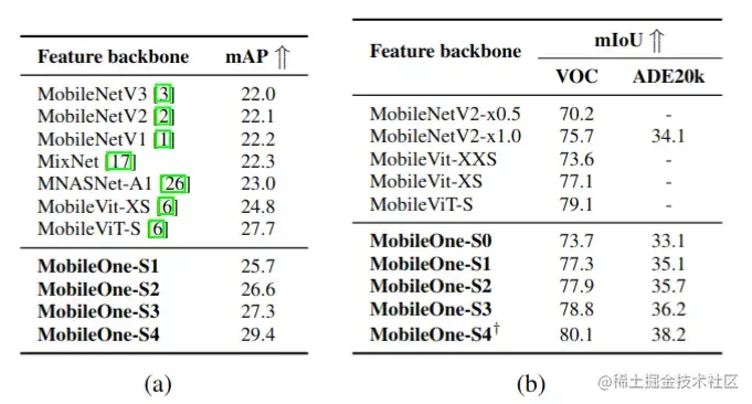 MobileOne 不仅在分类任务上取得了速度与精度的最佳权衡,它在检测(图 11.a)和分割(图 11.b)任务中,也取得了非常不错的成果。