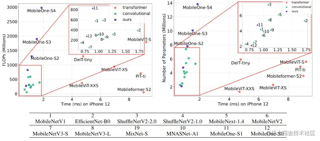 图 1 常用轻量级模型在 iPhone12 上的表现