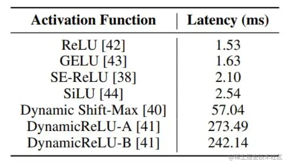 作者又分析了基本模块对推理时间的影响,主要是激活函数,残差结果以及 SE 模块的影响。图 3 展示了激活函数对推理时延的影响,使用复杂的激活函数虽然可以带来精度上的非常小的提升,但它会带来推理时延巨大增加。图 4 是 SE 模块与残差模块对推理时延的影响,它们都增加了大量的推理时延,文章中也给出了解释,这类多分支结构,会带来额外的访存开销。