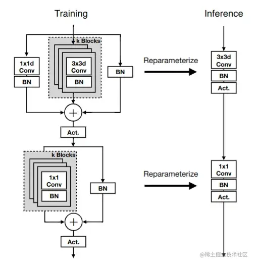 在推理状态下, DepthWise 卷积模块 和 PointWise 卷积模块只有一个 3×3 DepthWise 卷积和 1×1 PointWise 卷积,没有其他额外的分支,其中卷积和 BN 还可以进一步融合。