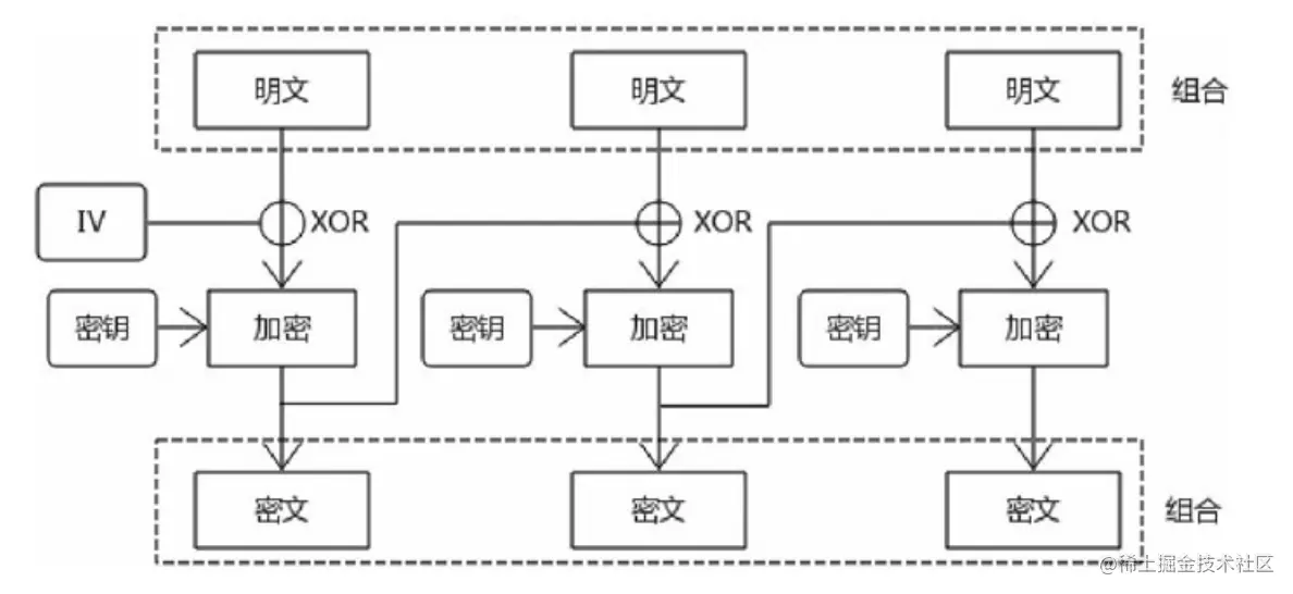 CBC模式(Cipher Block Chaining)是比较常见的一种迭代模式,解决了ECB模式的安全问题