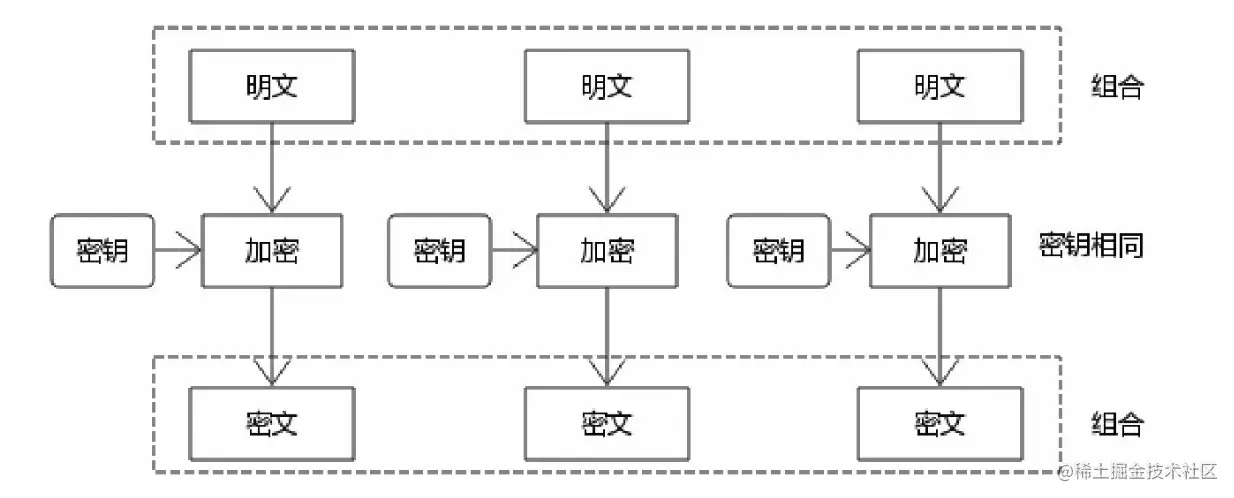 加密过程:分组单独加密然后组合成密文