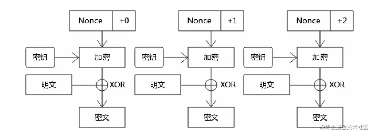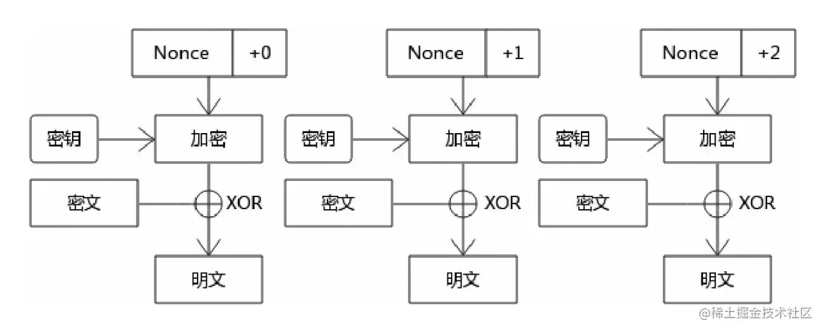 这里的Nonce也是基于某种随机算法得到的随机值,很难被猜测,+0、+1表示密钥流是依次递增。且初始Nonce也是需要明文传递给解密方的