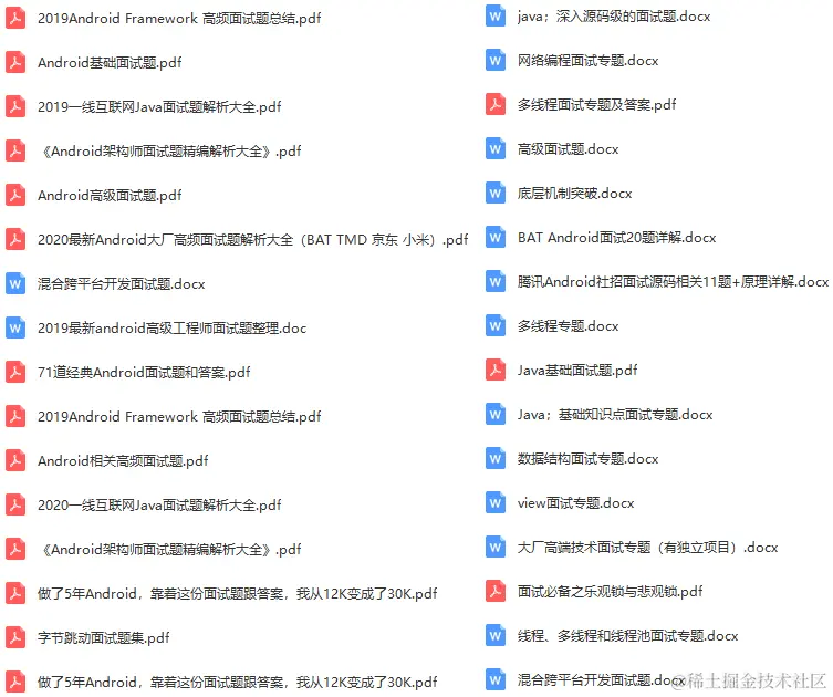 下面是有几位Android行业大佬对应上方技术点整理的一些进阶材料。有 Android架构视频+BATJ面试专题PDF+核心笔记等+源码+思维导图 。希望能够帮助到大家提升技术。