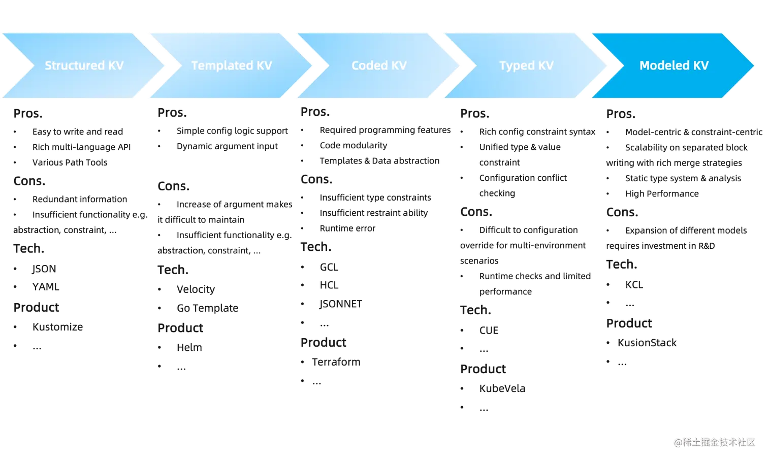 - 模型抽象与约束的必要性:对于较大规模的配置场景特别是对多租户、多环境等有配置模型和运维特性研发和沉淀迫切需求的,可以使用代码化、类型化和模型化的 KV 方式。