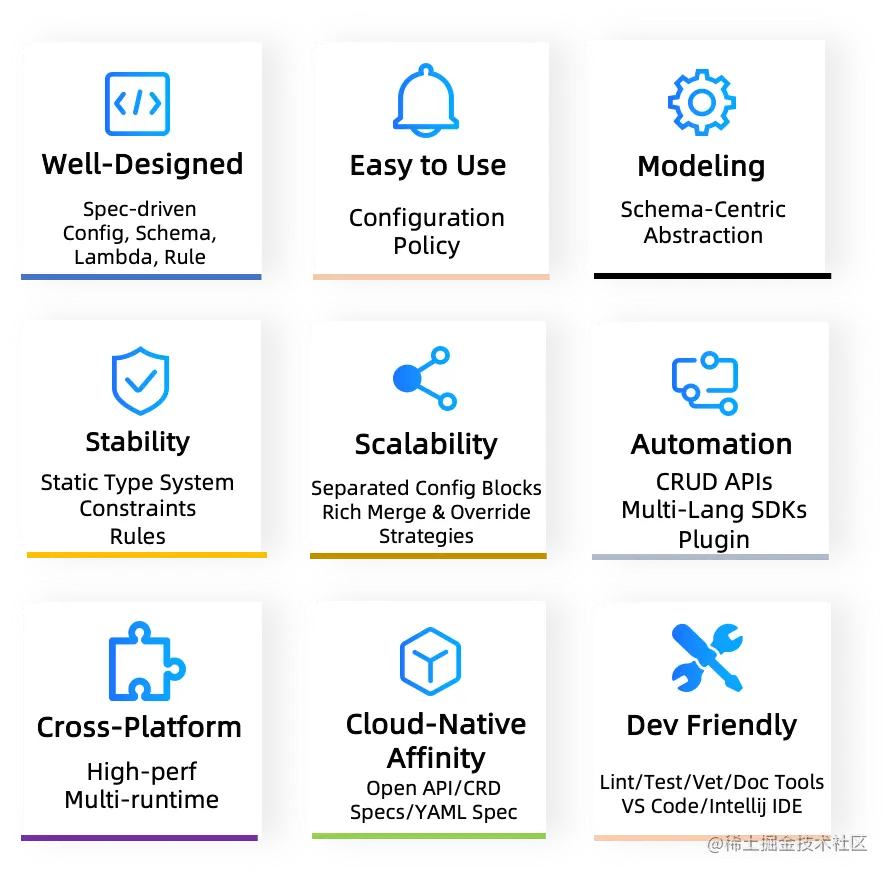 - 类型和值混合定义提高抽象程度的同时提升了用户的理解成本,并且所有约束在运行时进行检查,大规模配置代码下有性能瓶颈