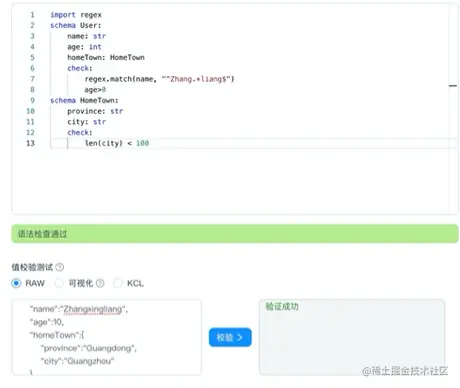 综上可以看出:CUE 和 KCL 均可以覆盖到绝大多数配置校验场景,并且均支持属性类型定义、配置默认值、约束校验等编写,但是 CUE 对于不同的约束条件场景无统一的写法,且不能很好地透出校验错误,KCL 使用 check 关键字作统一处理,支持用户自定义错误输出。