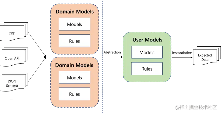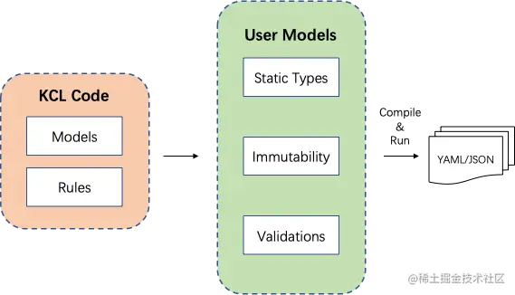 - 以领域模型为中心的配置视图:借助 KCL 语言丰富的特性及 KCL OpenAPI 等工具,可以将社区中广泛的、设计良好的模型直接集成到 KCL 中(比如 K8s 资源模型),用户也可以根据自己的业务场景设计、实现自己的 KCL 模型 (库) ,形成一整套领域模型架构交由其他配置终端用户使用。