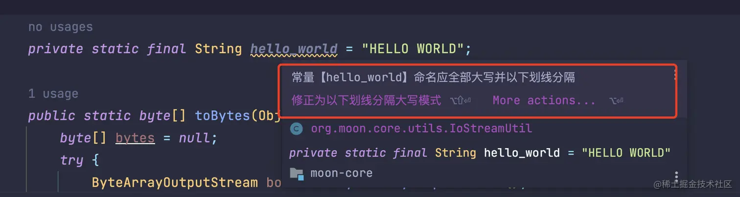 比如前面说的那个 hello_world变量名,插件直接提示「修正为以下划线分隔的大写模式」。
