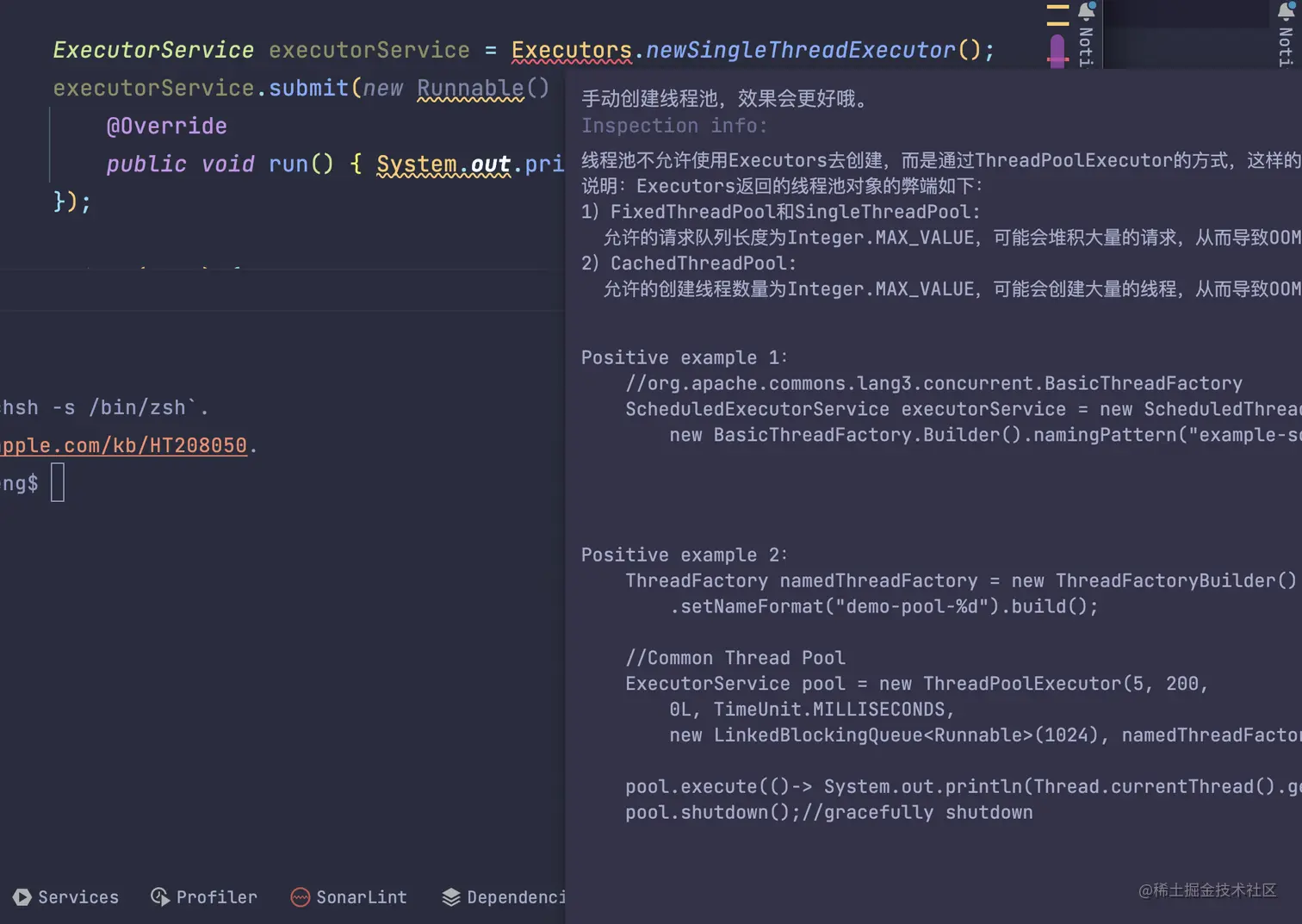 还有,比如对线程池的使用,有根据规范建议的内容,建议自己定义核心线程数和最大线程数等参数,不建议使用 Excutors工具类。
