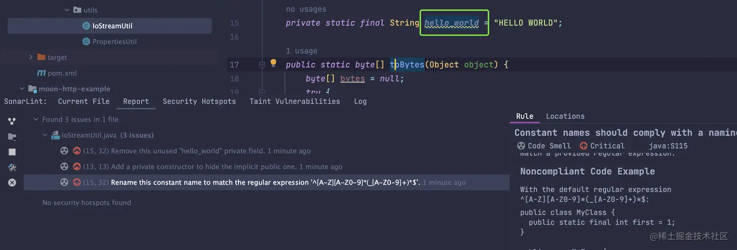 例如下面这个名称为 hello_world的静态 final变量,SonarLint 给出了两项建议。