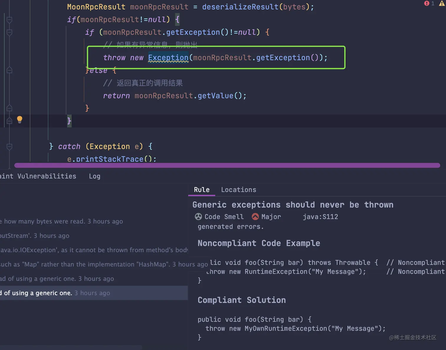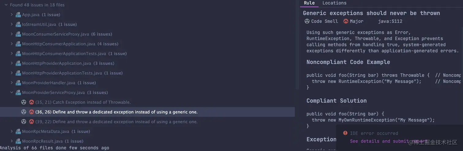 例如下面的异常抛出方式,直接抛出了 Exception,然后 SonarLint 建议不要使用 Exception,而是自定义一个异常,自定义的异常可能让人直观的看出这个异常是干什么的,而不是 Exception基本类型导出传递。