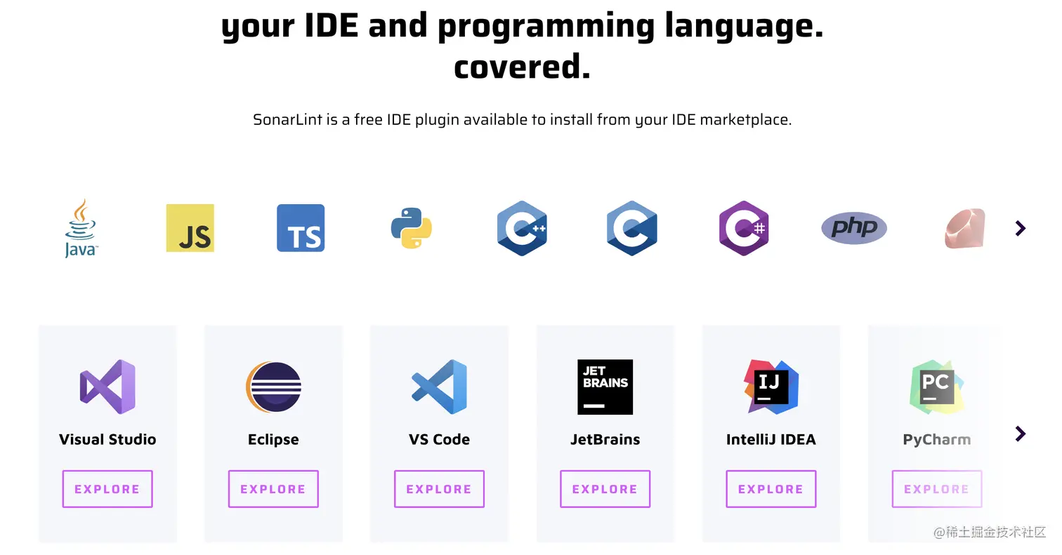 还可以直接在官网下载,打开页面https://www.sonarsource.com/products/sonarlint/,在页面中可以看到多种语言、多种开发工具的下载图标,点击下方的 EXPLORE即可到下载页面去下载了。虽然我们只是在 IDEA 中使用,但是它不管支持 Java 、不只支持 IDEA ,还支持 Python、PHP等众多语言,以及 Visual Studio 、VS Code 等众多 IDE。