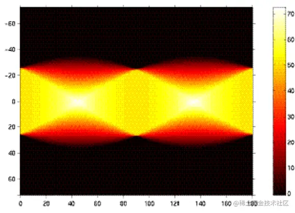 imshow(theta,xp,R,[]), colormap(hot), colorbar