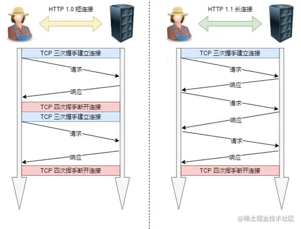 为了解决上述 TCP 连接问题,HTTP/1.1 提出了长连接的通信方式,也叫持久连接。这种方式的好处在于减少了 TCP 连接的重复建立和断开所造成的额外开销,减轻了服务器端的负载。