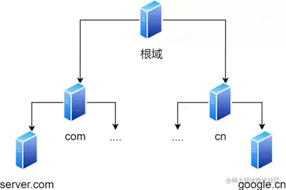 根 DNS 收到来自本地 DNS 的请求后,发现后置是 .com,说:“www.server.com 这个域名归 .com 区域管理”,我给你 .com 顶级域名服务器地址给你,你去问问它吧。”
