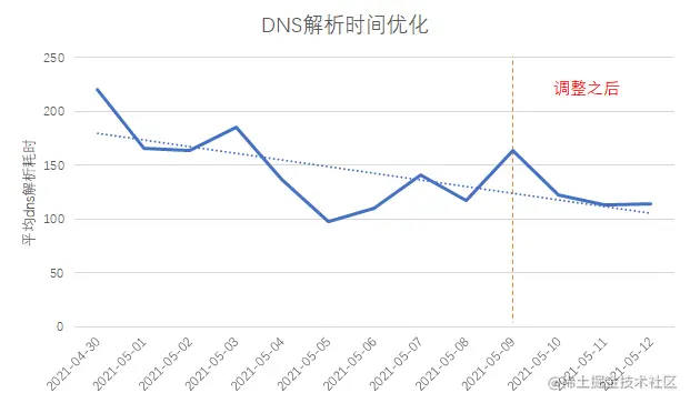 通过对调整前后的DNS解析时间进行比较,可以看到耗时降低了30ms左右。