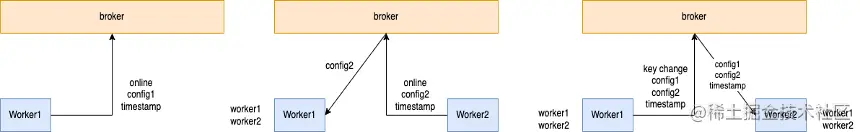 Connector 的配置/Offset信息同步通过每个 Worker订阅相同的 Topic,不同Worker 使用不同的 Consumer Group 实现的, Worker 节点可以通过这种方式消费到相同Topic的所有数据,即Connector配置/Offset信息,这类似于广播消费模式,这种数据同步模式可以保证任何一个 Worker 挂掉,该Worker上的任务依旧可以在存活的 Worker 正常拉起运行 ,并且可以获取到任务对应的 Offset 信息实现断点续传, 这是故障转移以及高可用能力的基础。