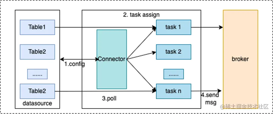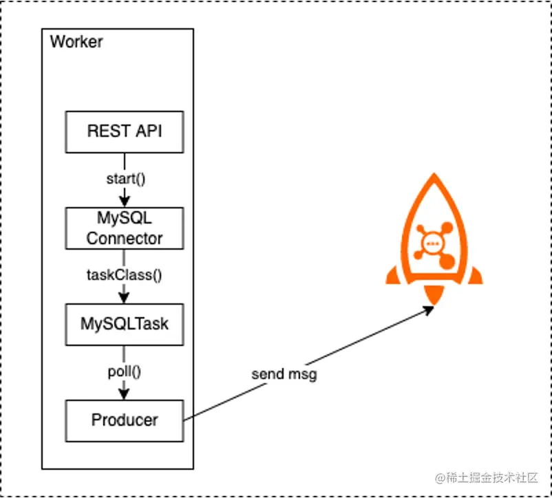 创建 Connector 任务后, Worker 中会创建一个或者多个线程,不停的轮询 Poll方法,从而获取到MySQL表中的数据,再通过 RocketMQ Producer 发送到 RocketMQ Broker中,这就是 Connector 从实现到运行的整体过程(见下图)。