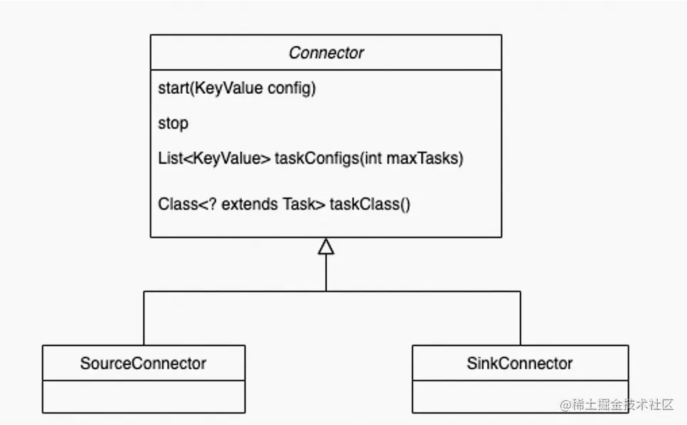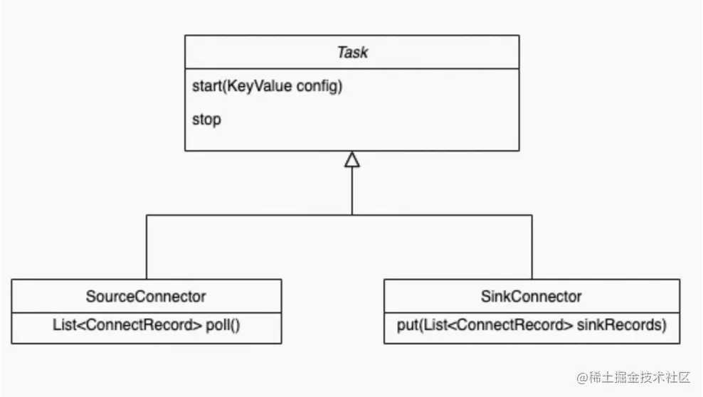 通过Connect的API也可以看到Connector和Task各自的职责,Connector实现时就已经确定数据复制的流向,Connector接收数据源相关的配置,taskClass获取需要创建的任务类型,通过taskConfigs的数量确定任务数量,并且为Task分配好配置。Task拿到配置以后数据源建立连接并获取数据写入到目标存储。通过下面的两张图可以清楚的看到,Connector和Task处理基本流程。