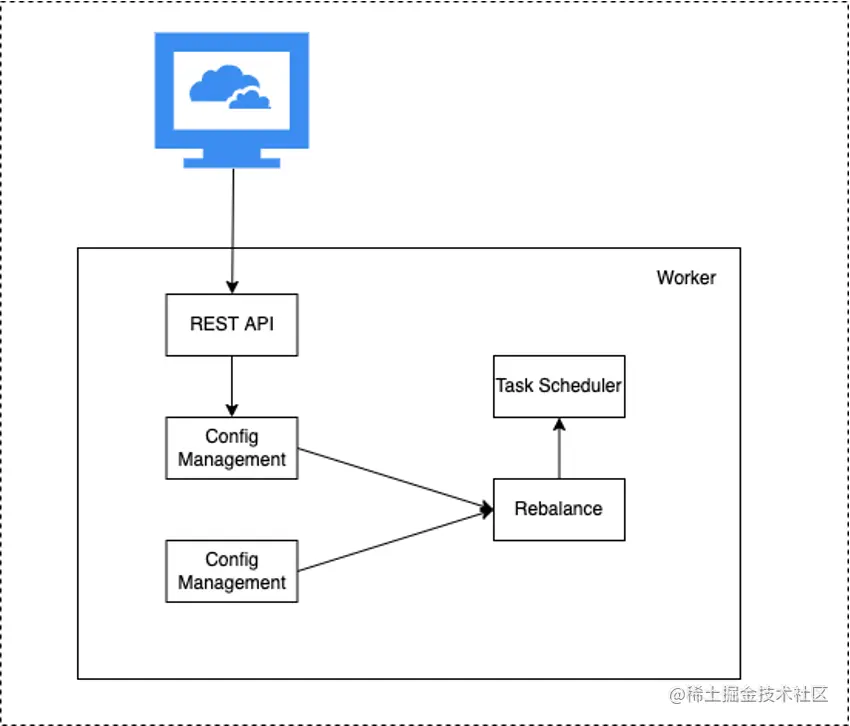 一个 RocketMQ Connect 集群中会有多个 Connector ,每个 Connector 会对应一个或多个 Task,这些任务运行在 Worker(进程)中。Worker进程是Connector和Task运行环境,它提供RESTFull能力,接收HTTP请求,将获取到的配置传递给Connector和Task,它还负责启动Connector和Task,保存Connector配置信息,保存Task同步数据的位点信息,除此以外,Worker还提供负载均衡能力,Connect集群高可用、扩缩容、故障处理主要依赖Worker的负责均衡能力实现的。Worker 提供服务的流程如下: