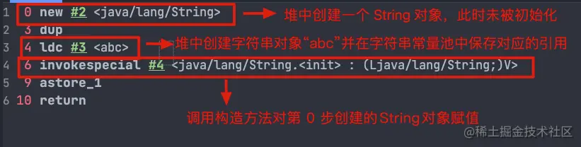 这里就不对上面的字节码进行详细注释了,7 这个位置的 ldc 命令不会在堆中创建新的字符串对象“abc”,这是因为 0 这个位置已经执行了一次 ldc 命令,已经在堆中创建过一次字符串对象“abc”了。7 这个位置执行 ldc 命令会直接返回字符串常量池中字符串对象“abc”对应的引用。
