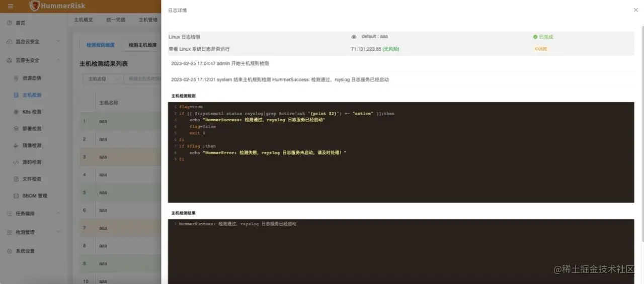 点击按钮可以查看详细的执行状态日志,同时会显示检测的结果是否存在风险,分有风险和无风险两种情况。