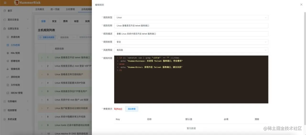 在这里用户可以根据自己的需要去添加检测规则,也可以对系统中自带的检测规则进行编辑。定义检测规则时,还可以添加参数,对应的在脚本中写入key,就可以实现变量传递的作用。