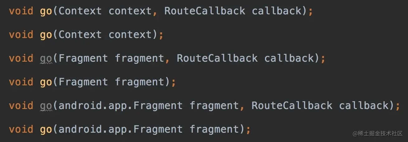go()有如上几个重载方法,如果是在Fragment中发起startActivityForResult路由操作,切记传当前fragment实例哦!不然在fragment中是接受不到回调的。