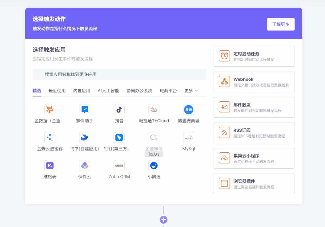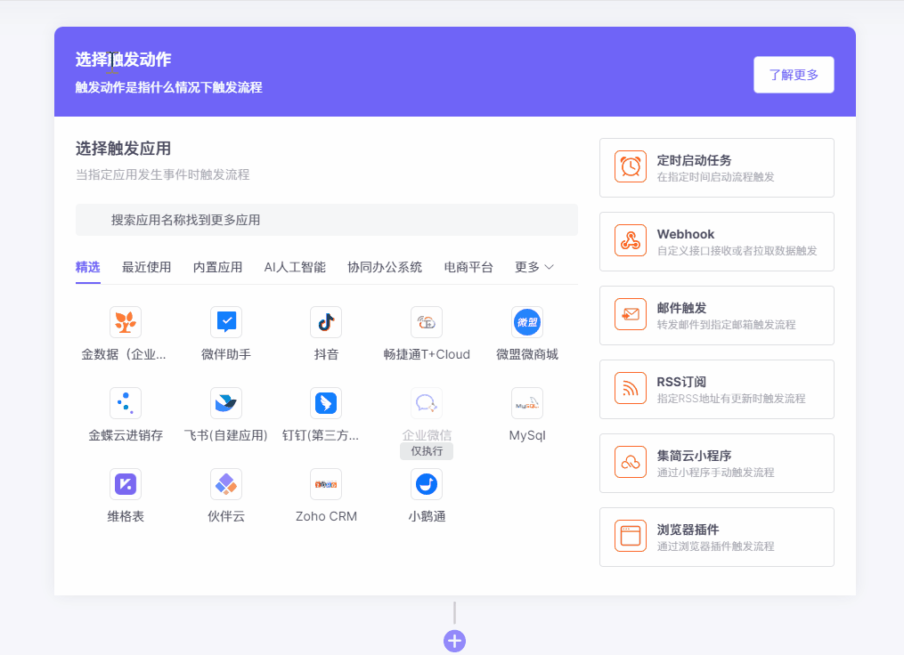 ○ 触发应用:选择您的业务场景用到的软件或者应用,如果您是业务人员,您会选择某个差旅系统;