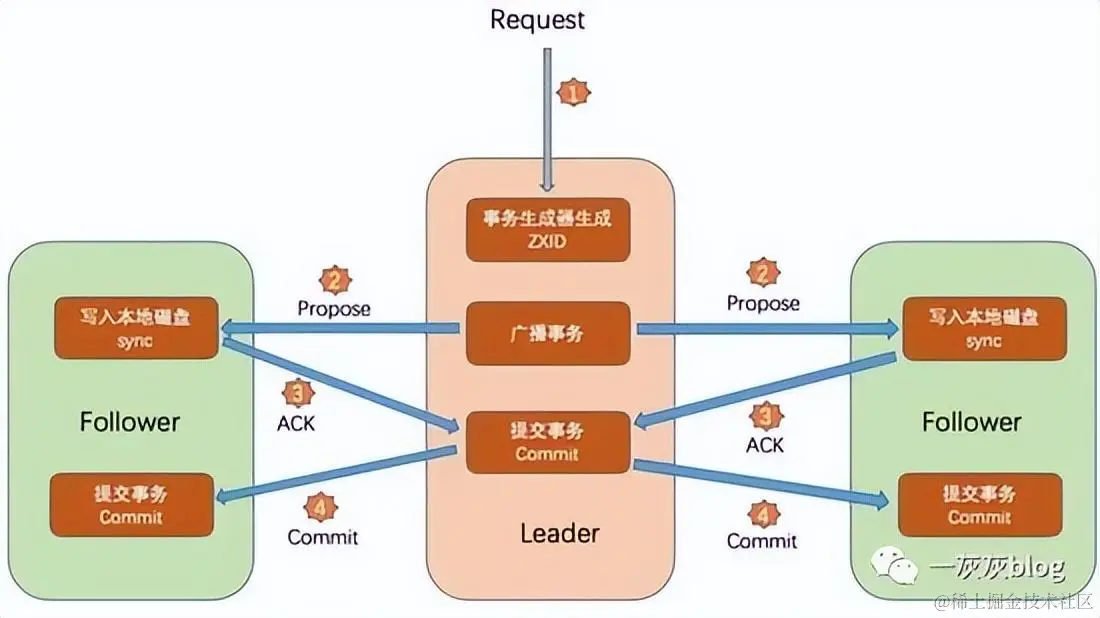 主要用于zk的数据一致性场景,其核心思想是Leader再接受到事务请求之后,通过给Follower,当半数以上的Follower返回ACK之后,Leader提交提案,并向Follower发送commit信息
