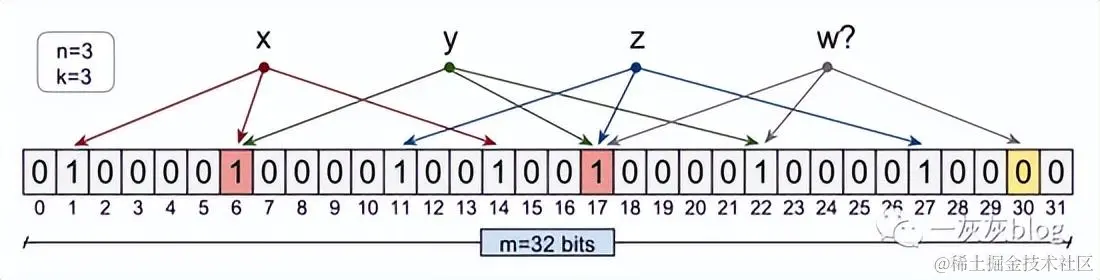 检索时,我们只要看看这些点是不是都是 1 就大约知道集合中有没有它了,也就是说,如果这些点有任何一个 0 ,则被检元素一定不在;如果都是 1 ,则被检元素很可能在。