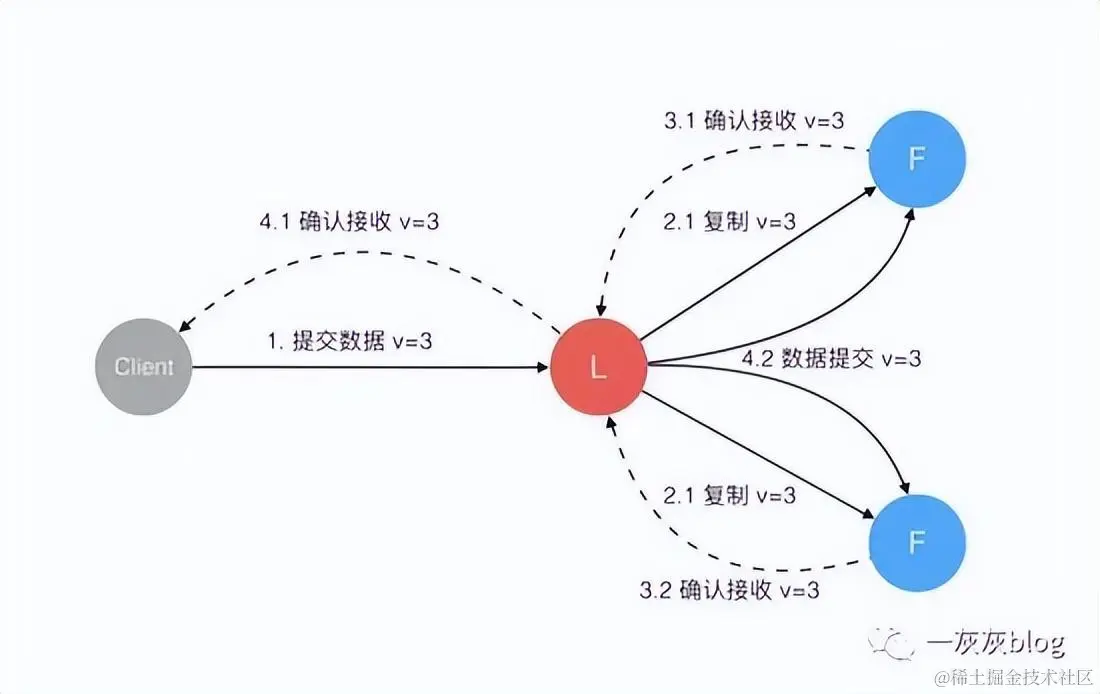 leader接受请求,并转发给follow,当大部分follow响应之后,leader通知所有的follow提交请求、同时自己也提交请求并告诉调用方ok