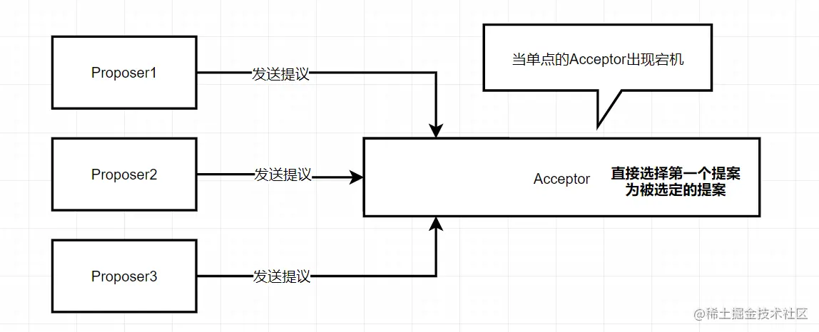 最简单的选定方式是只有一个Acceptor, Proposer发送给该Acceptor提案以后, Acceptor直接选择第一个提案为被选定的提案。但这种做法一旦Acceptor出问题, 整个系统将无法正常工作。