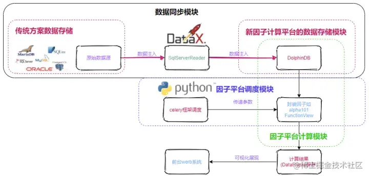 基于 DolphinDB 与 Python Celery 框架的因子平台构建,主要包括基于 dataX 的 SQL Server Reader (历史数据同步模块)和 DolphinDB (数据存储与计算模块)的数据源注入,DolphinDB 因子函数的定义和调用,Celery 框架(因子平台调度模块)调用因子函数传递参数和最终以 Dataframe 格式的数据可视化展示等。其整体构图如下所示: