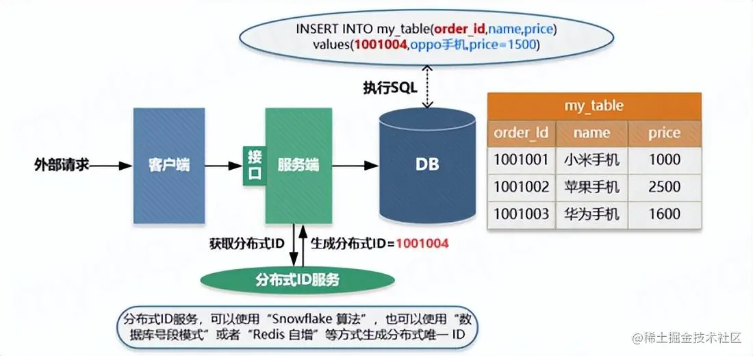 - 服务端执行业务逻辑,生成一个分布式 ID,将该 ID 充当待插入数据的主键,然后从数据插入操作,运行对应的 SQL 语句。