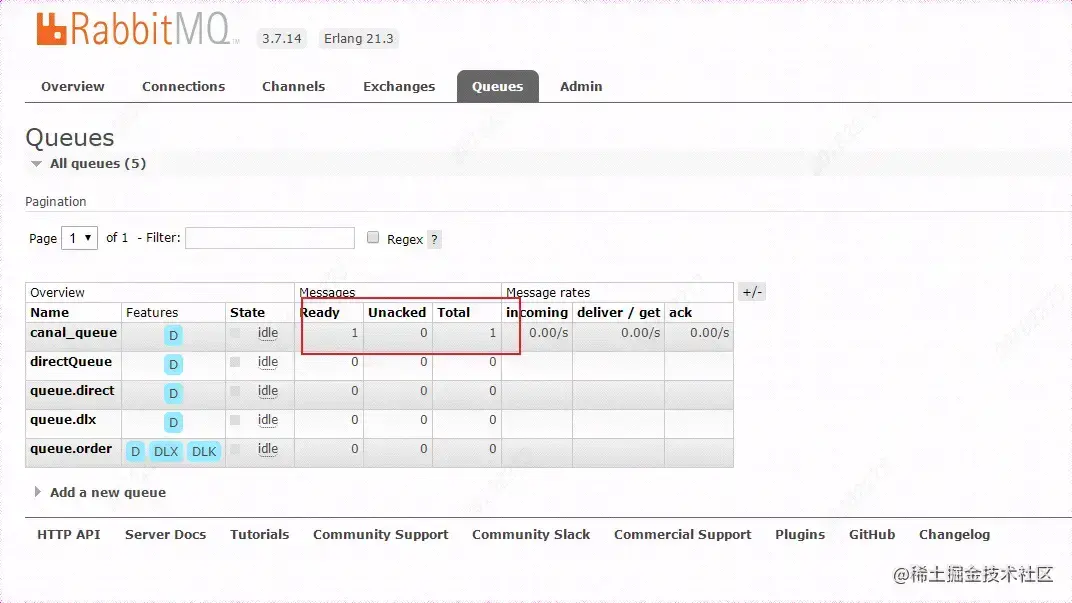 当我执行完 update 方法的时候,去RabbitMQ Management 查看,发现并没有消息进入队列。
